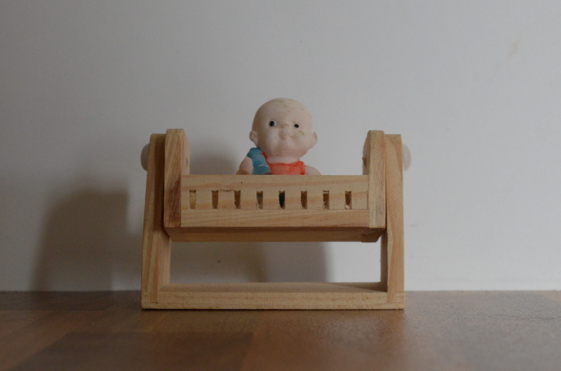 Pynt til barneværelset eller barnedåbs bordpynt, vugge i træ og baby i polyresin. H. 6,5 cm., L. 7,5 cm.