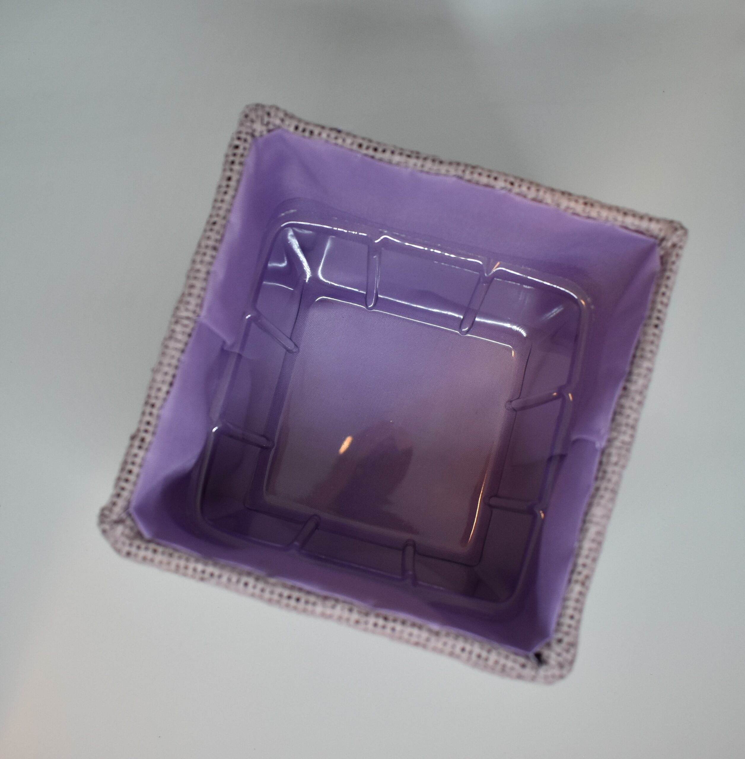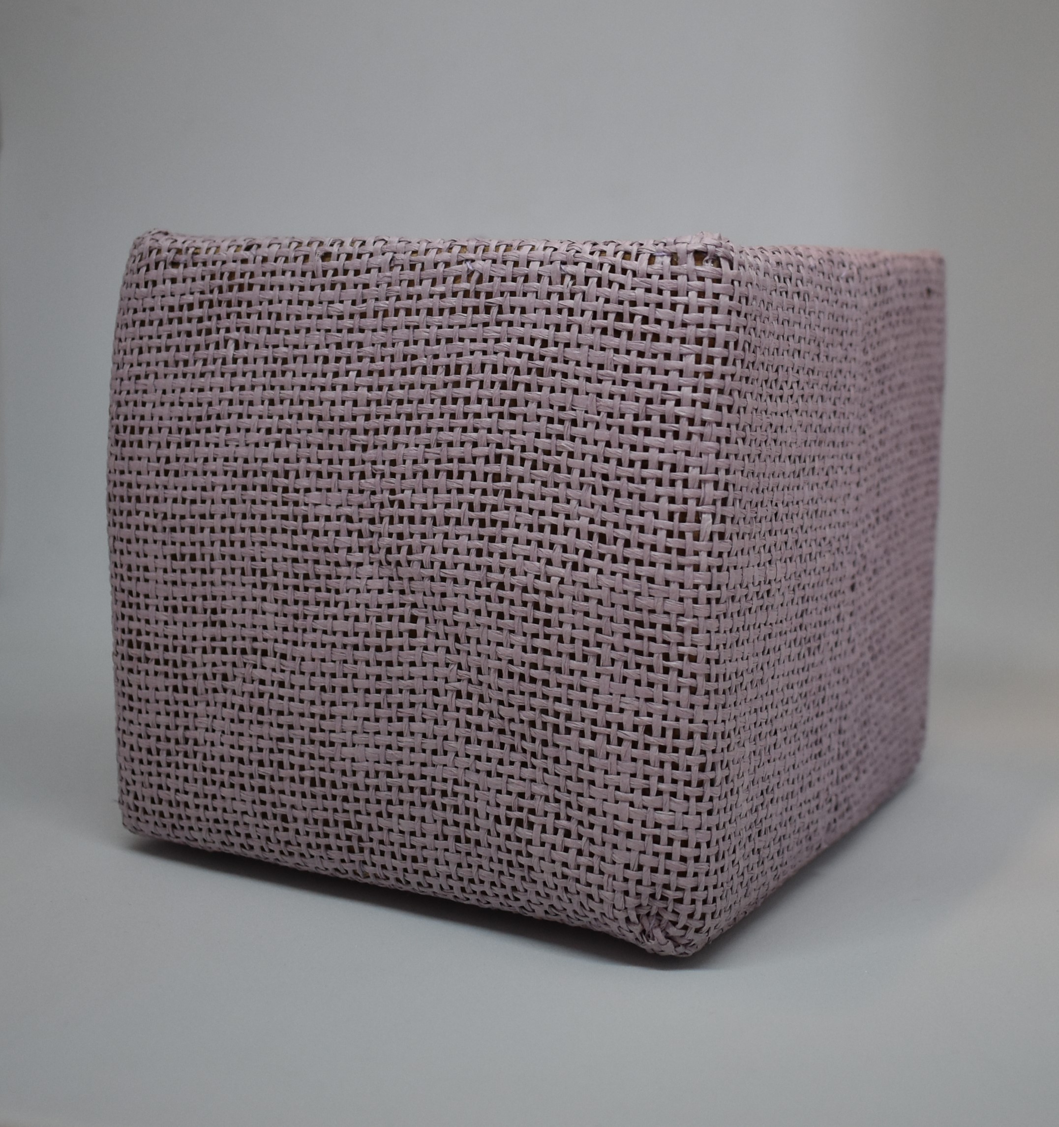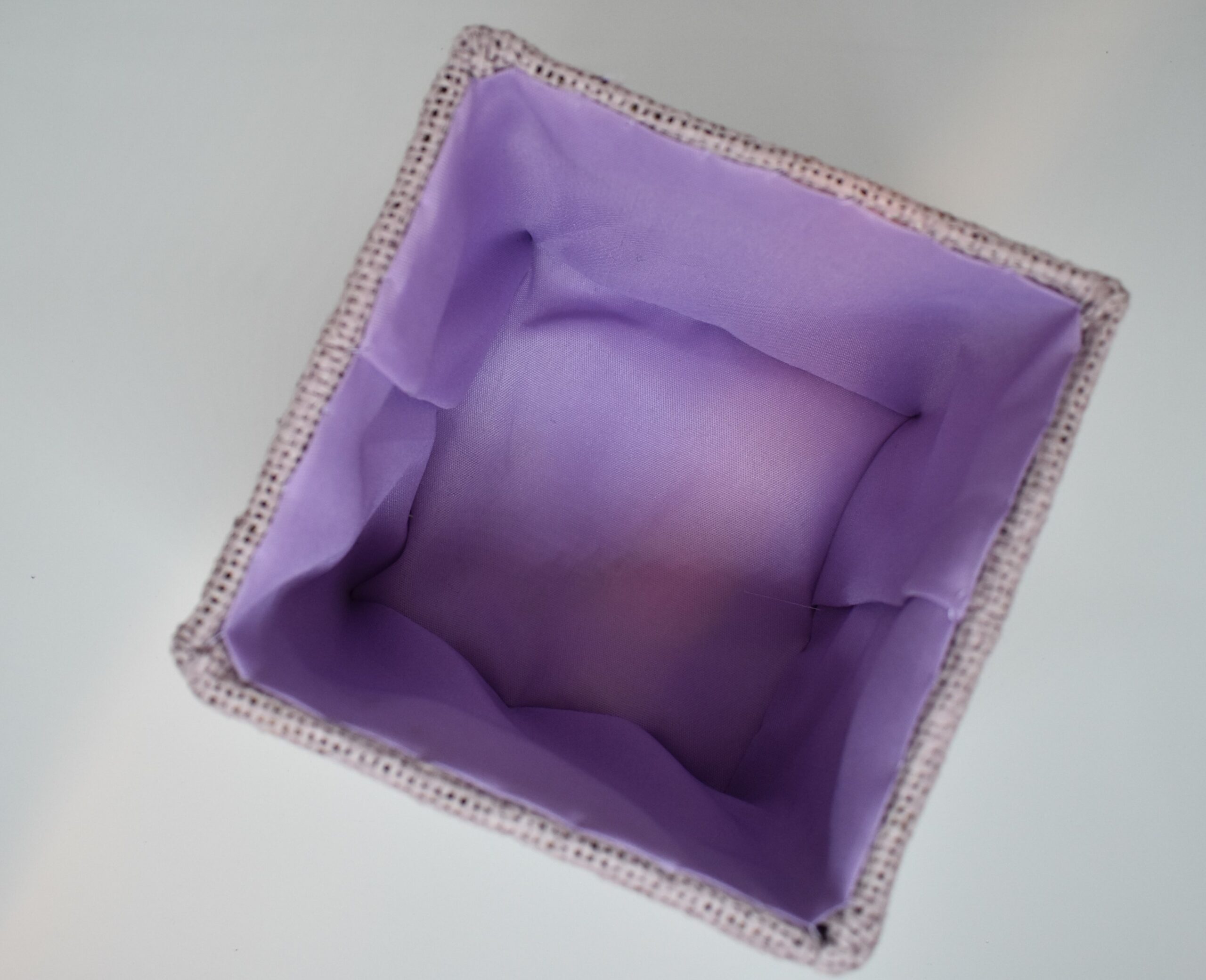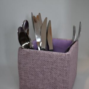 Sød og dekorativ beholder / urtepotteskjuler, 12,5 x 13,5 x 13,5 cm. Beklædt med Hessian på alle ydre sider og Nylon stof indvendig, der følger en lille indsats i plastik med til brug som urtepotteskjuler.
