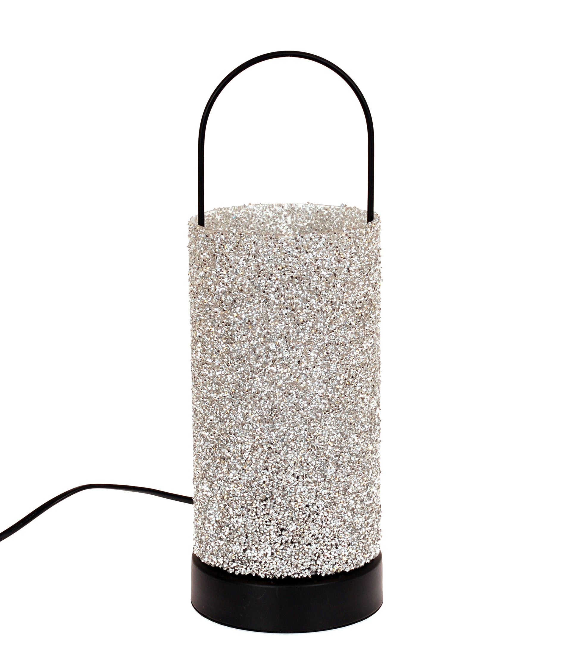 Flot dekorativ bord lampe med sorte og guld sten limet på en glas cylinder, sort metal fod, med sort metal bøjle. H. 36 cm. D. 12 cm. Fås i 3 varianter.