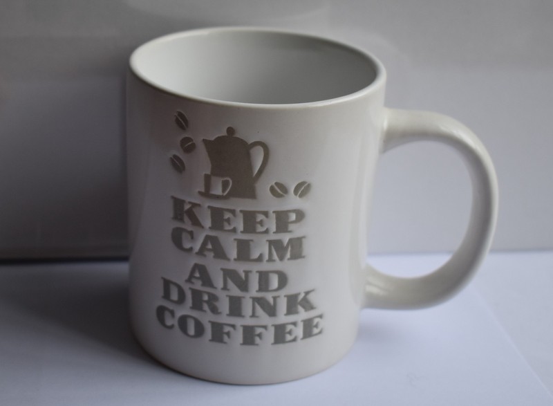 Krus i porcelæn med tekst : Keep calm and drink coffee. H. 10 cm. Fås i 3 farver.