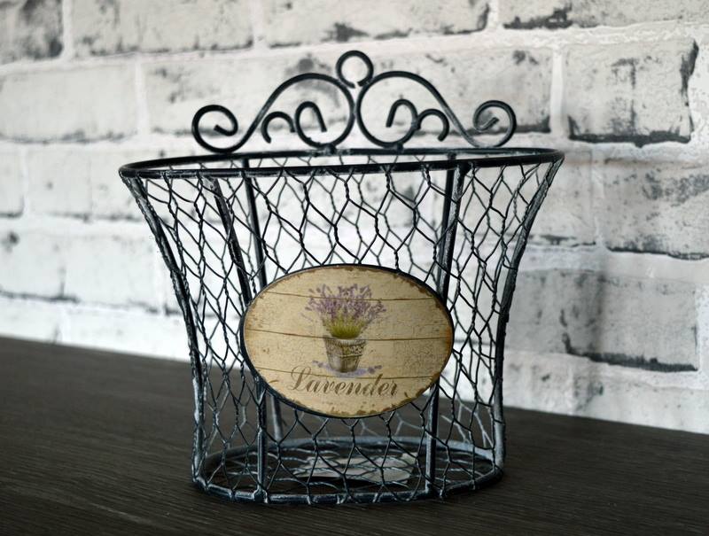 Kurv/ beholder i trådnet, til at hænge eller stå. Provence stil, meget dekorativ. H. 18 * 18 * 11 cm.