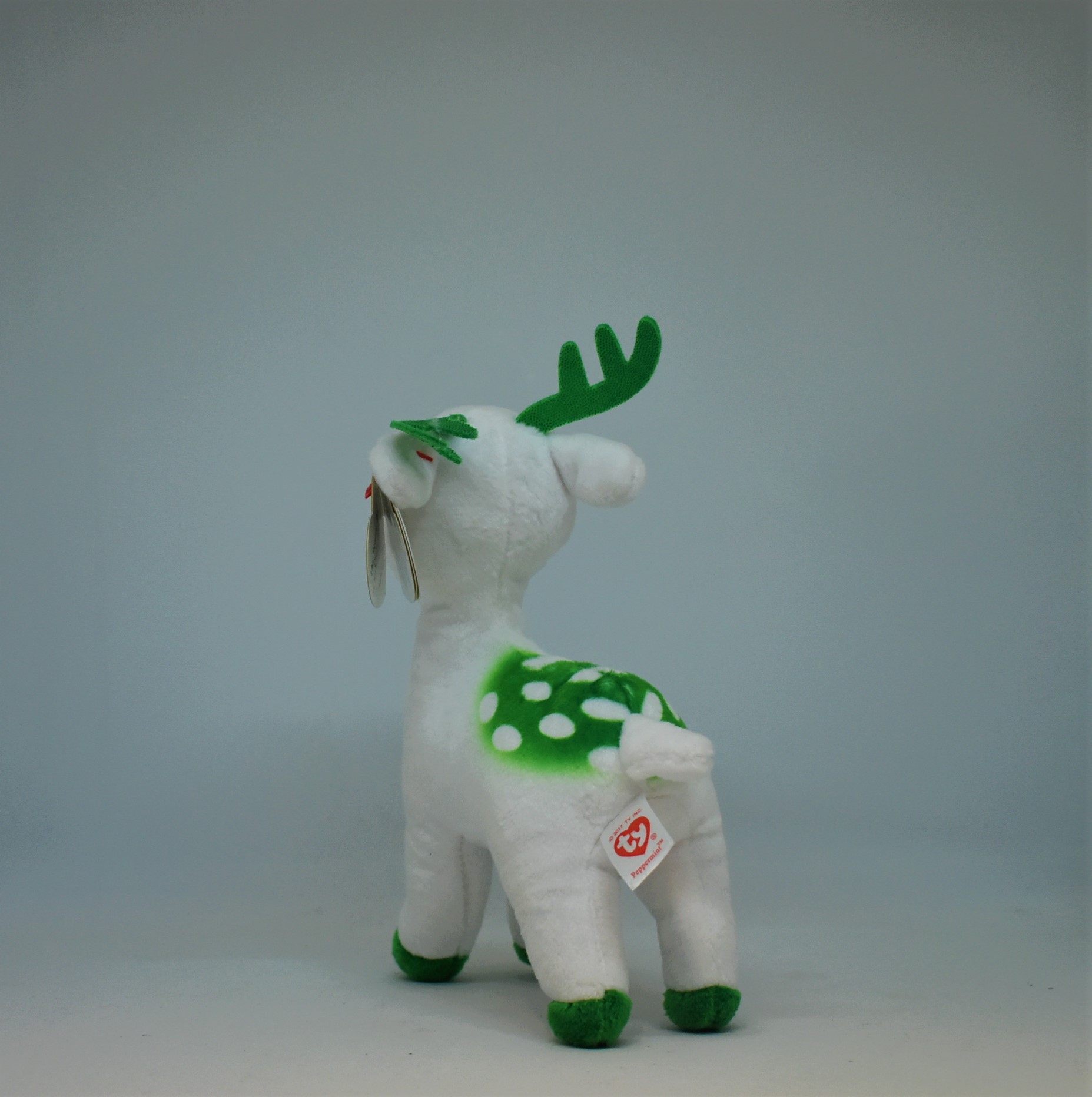 Det skønneste lille rensdyr med grøn og hvid prikket bagdel, navnet er Peppermint, den har fødselsdag d.23 December. H. 15 cm.
