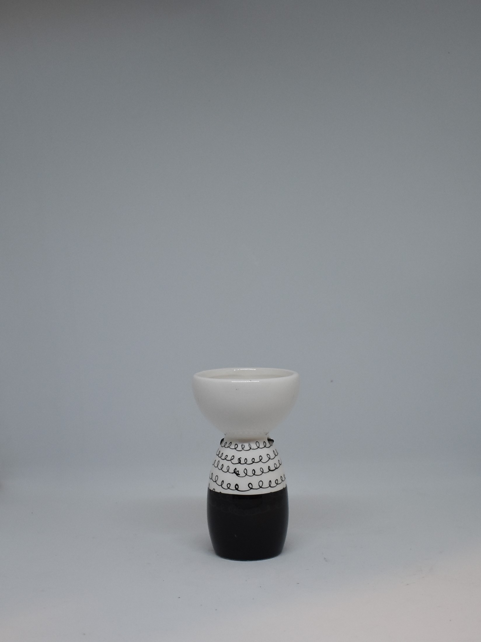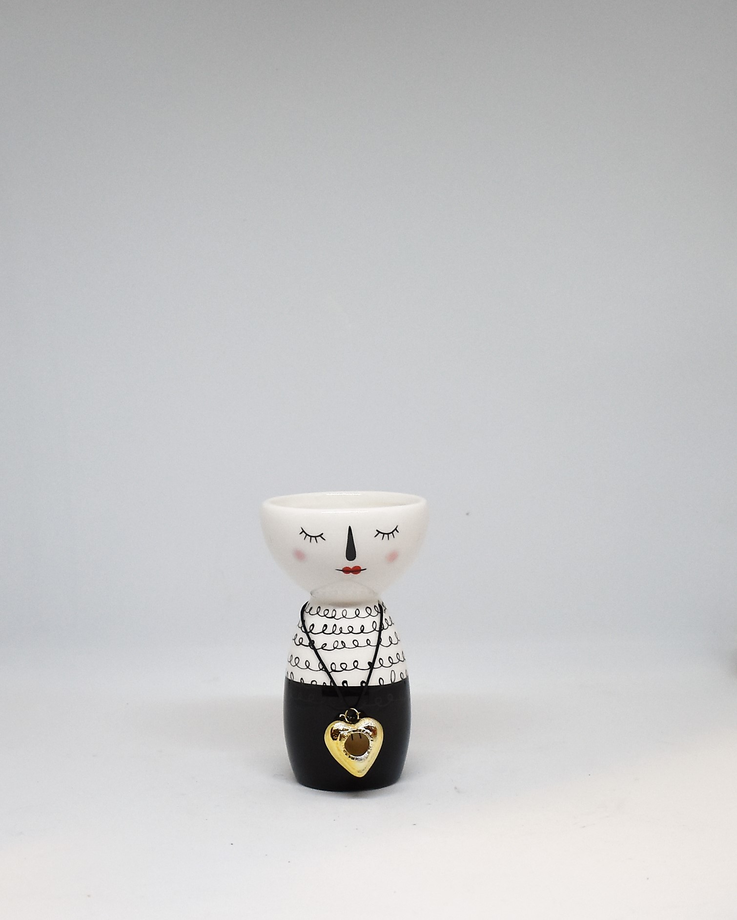 Flot lille vase med ansigt. i hvid, sort og guld. H.11 X 6,5 cm.